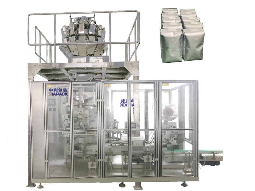 L'intera linea comprende un set di sacchetti vffs che forma una sigillatrice per il riempimento, una confezionatrice per sacchetti di adesivi con set top, un controllore del peso impostato e una macchina per il trasporto del buffer e un set di avvolgitrici per film termoretraibile. e deformazione. C'è una funzione opzionale aggiuntiva per il vuoto del sacchetto che può essere aggiunta a questa macchina dell'unità.