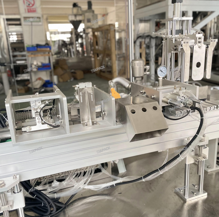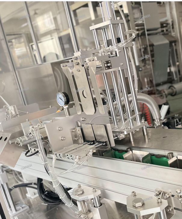 Questa macchina è un design speciale per realizzare la borsa a soffietto con l'etichettatura superiore. Dopo che la borsa piena con il prodotto è caduta su questa macchina. Questa macchina trasporterà la borsa, passerà una volta attraverso la piegatura della bocca della borsa e quindi attaccherà l'etichetta. Il telaio della macchina realizzato da SUS304. PLC e touch screen adottati dal marchio Siemens. E le parti pneumatiche adottano il marchio SMC. I componenti elettrici principali adottano il marchio Omron e Schneider. Questa macchina funziona con una confezionatrice automatica per raggiungere l'etichettatura superiore del sacchetto finito. Questa macchina può raggiungere automaticamente la funzione dell'etichetta separata, invio di etichette. Rilevatore di etichette e pressatura di etichette.