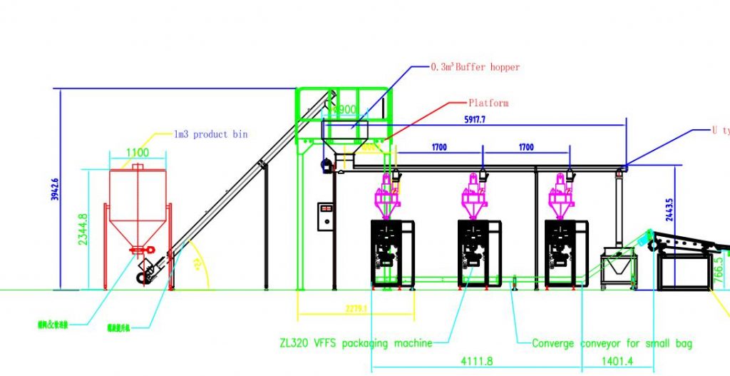 La parte secondaria è per la linea di trasporto centrale. compreso il trasportatore vibrante e orizzontale per raccogliere tutto il piccolo sacchetto per alimentare il trasportatore al passaggio successivo