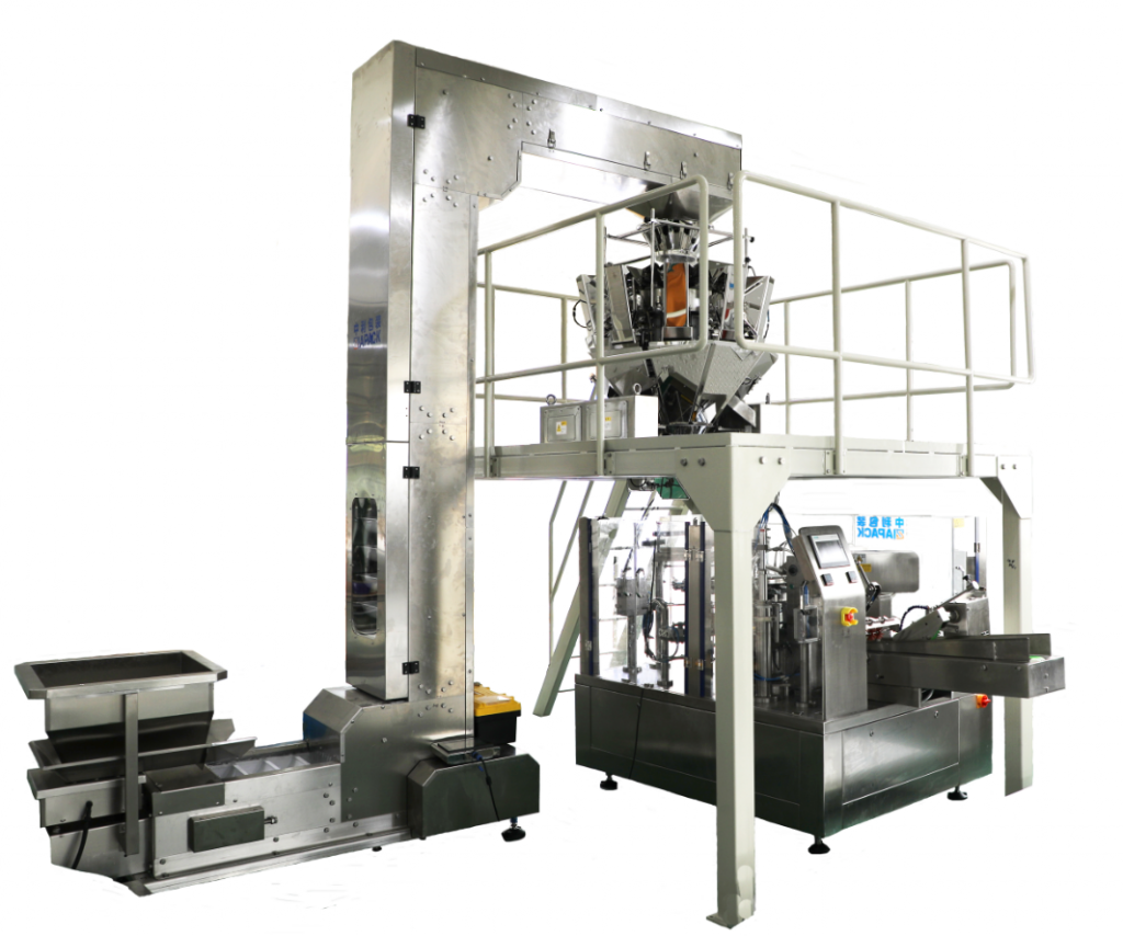 Confezionatrice con sacchetto rotante con dosaggi diversi (come pesatrice multitesta, riempitrice a coclea, riempitivo liquido ecc.) possono essere adatti per l'imballaggio automatico di granuli, polvere, liquidi, paste ecc. Vari tipi di prodotti con la busta con cerniera pre-montata e così via.