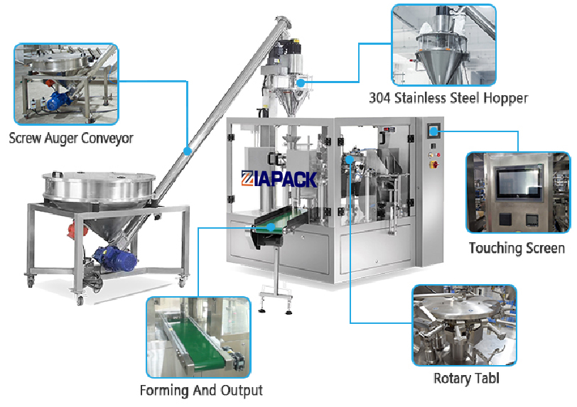 Dotato di Augur Filler e Screw Elevator, è ampiamente applicato alla polvere da imballaggio, come detersivo in polvere, latte in polvere, farina, spezie, polvere di cocco, caffè macinato e così via.